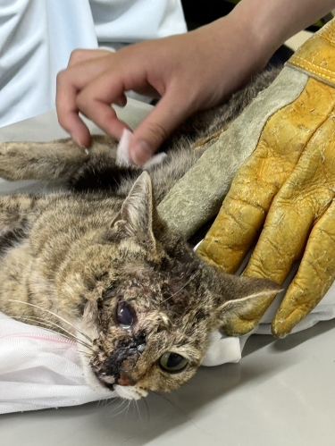 大怪我をしている猫ちゃんで、お医者さんには