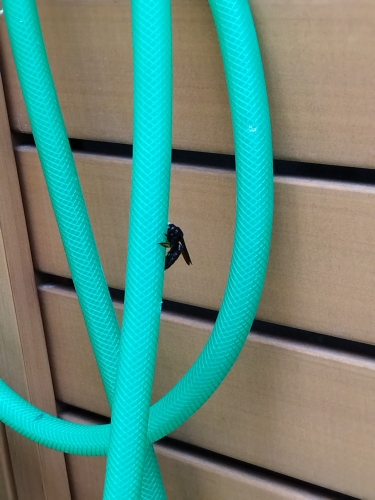 4月中旬から事務所の玄関庭の水やりのホースに黒い虫がたくさん飛び回っていて